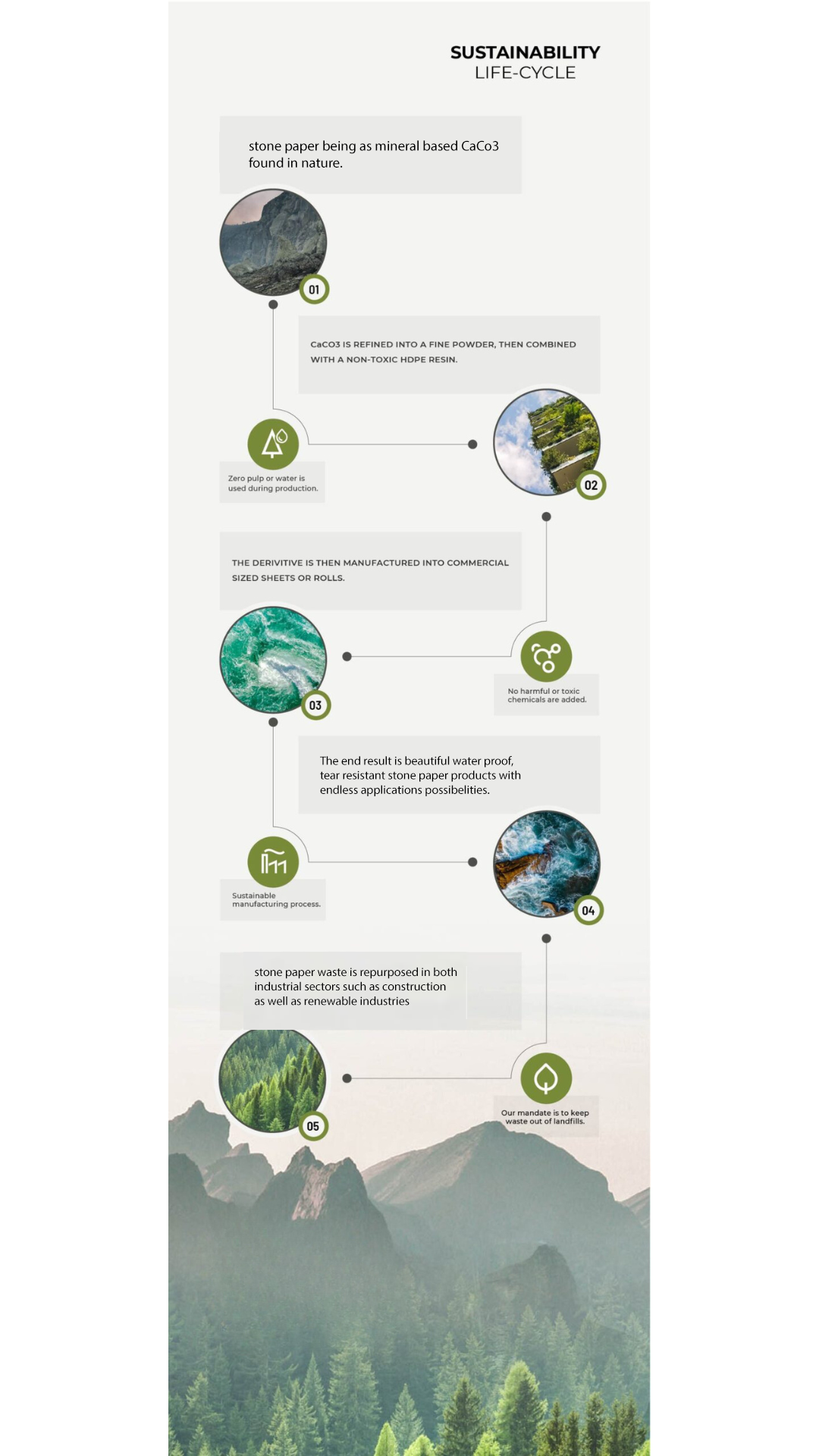 Stone paper products require no bleaches, acids, alkali, or other potentially dangerous ingredients to achieve its white color. Instead, our exceptionally white paper is derived from the high concentration of naturally white CaCO3 mineral content. As a result, the manufacturing of our Stone paper materials produces no pollution to the air, rivers and waterways with any harmful chemicals.